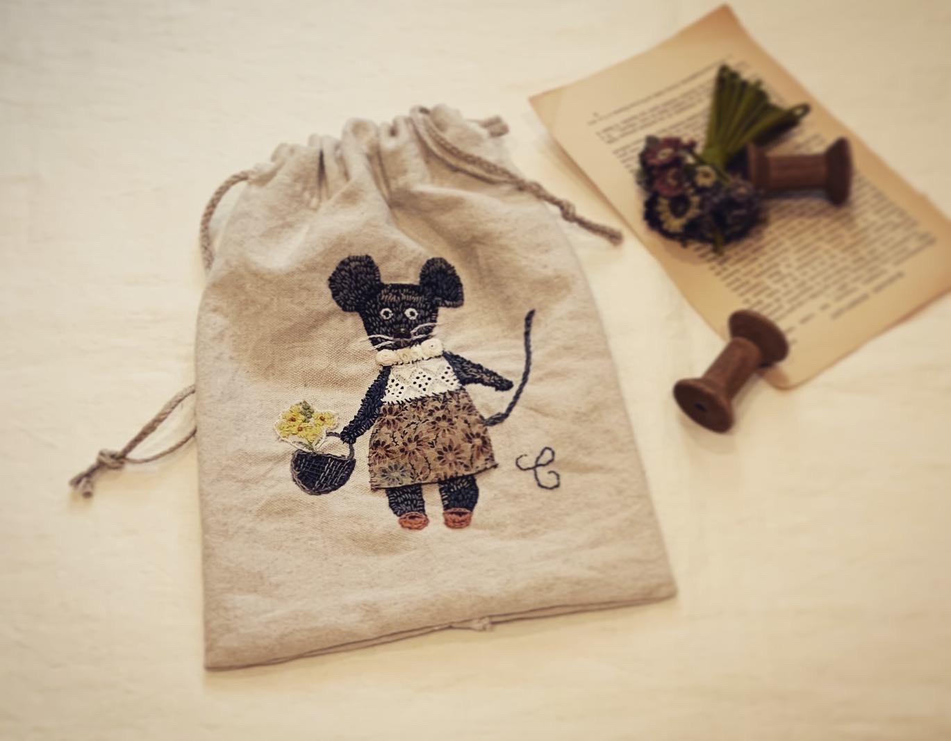 ねずみさんの巾着が出来ました。春らしく表裏にもお花が付いてます❣️