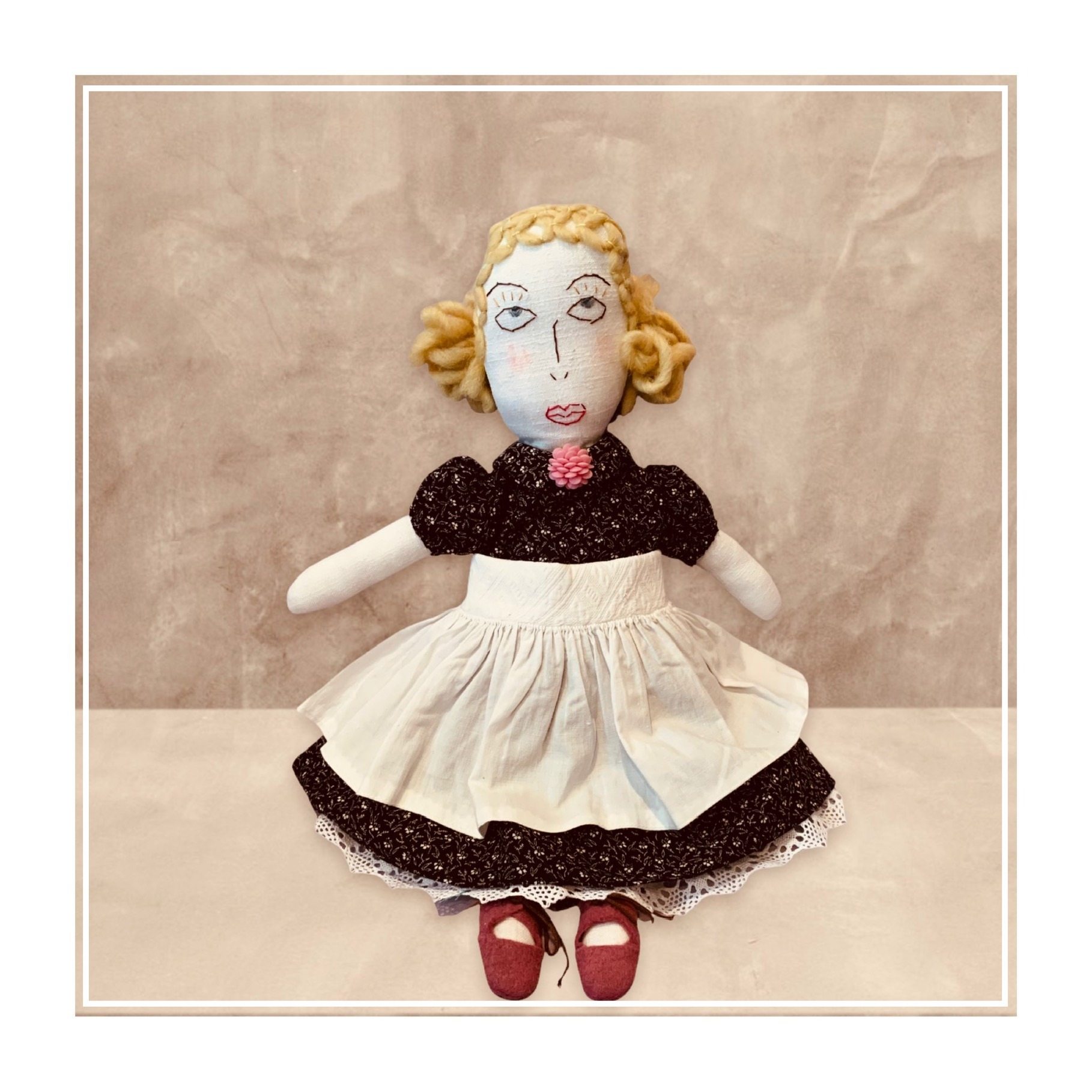 自ら フランス蚤の市で購入した アンティーク生地を使って作られたお洋服や、アンティークアクセサリーなどを身につけたお人形は、懐かしい感じの可愛いお人形です。