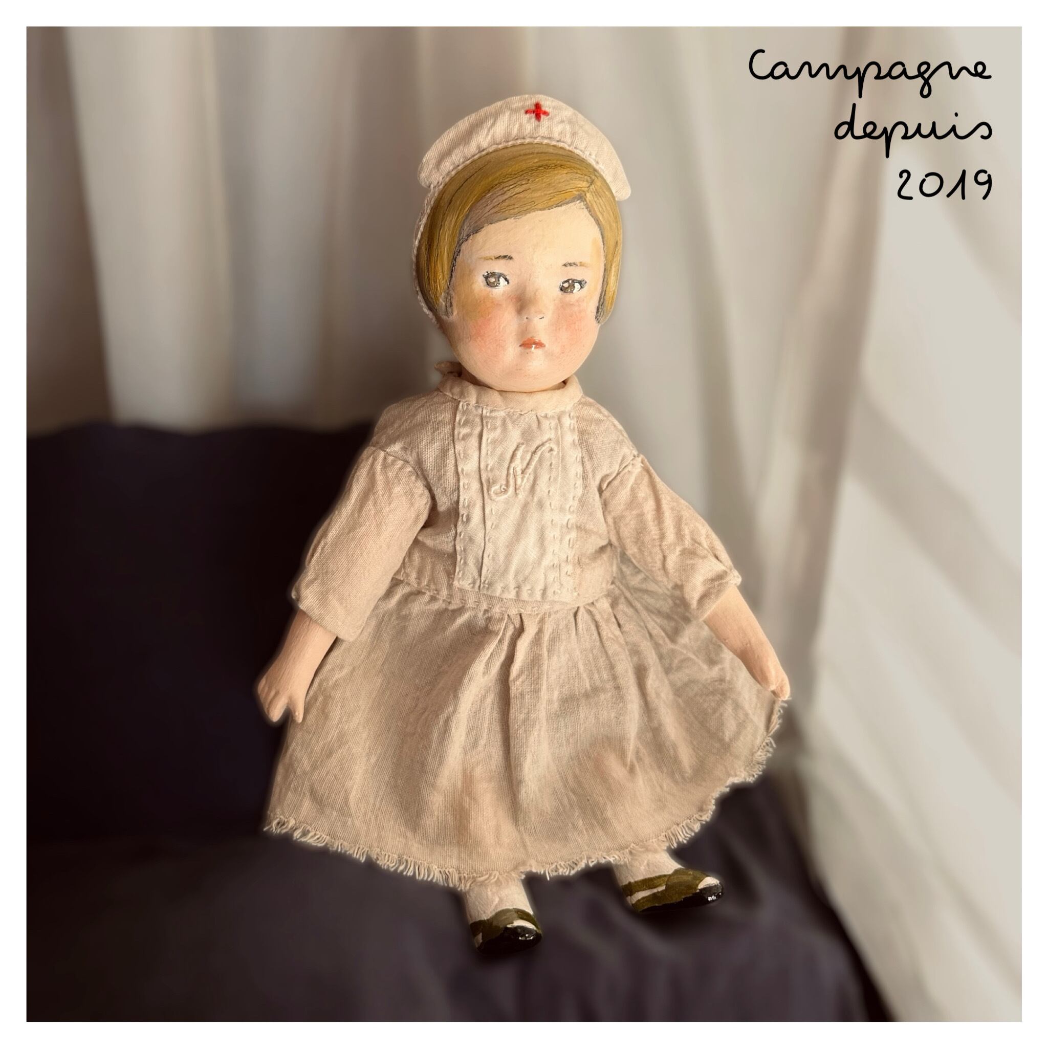 ニットのワンピース、アンティーク生地のエプロン、ヘアバンド。